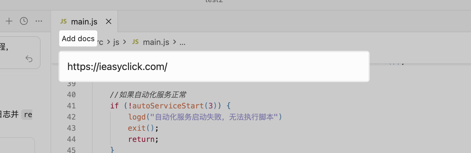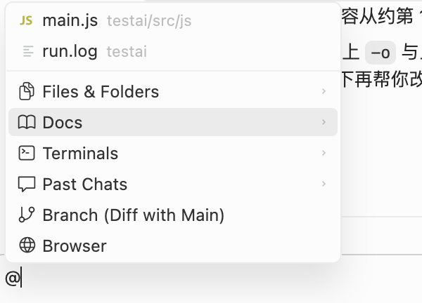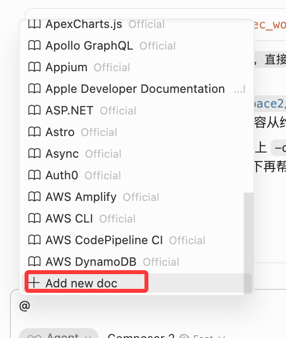 - 在和AI对话框中输入@符号,选择Docs,再次选择Add new doc,把EC的文档地址喂给AI,让AI自己抓取并理解