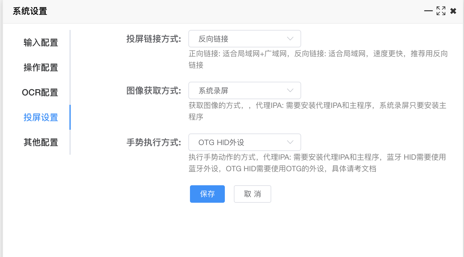 - 当前版本包含了代理投屏方式,录屏投屏,OTG或者蓝牙操作模式