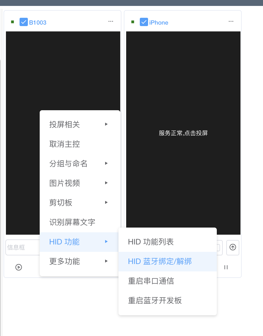 • 在连接设备,小屏幕上鼠标右键菜单-HID功能-HID蓝牙绑定/解绑