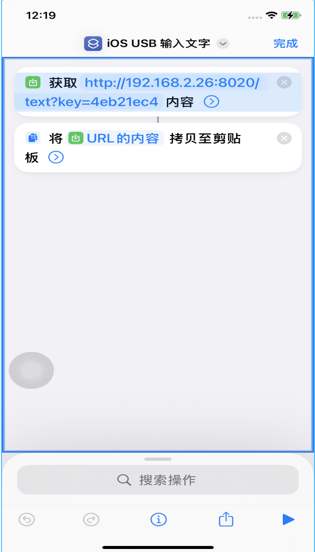 • 在快捷指令app中新建一条指令,名字为iOS USB设置剪贴板,指令内容如下,具体链接参数看文字输入说明