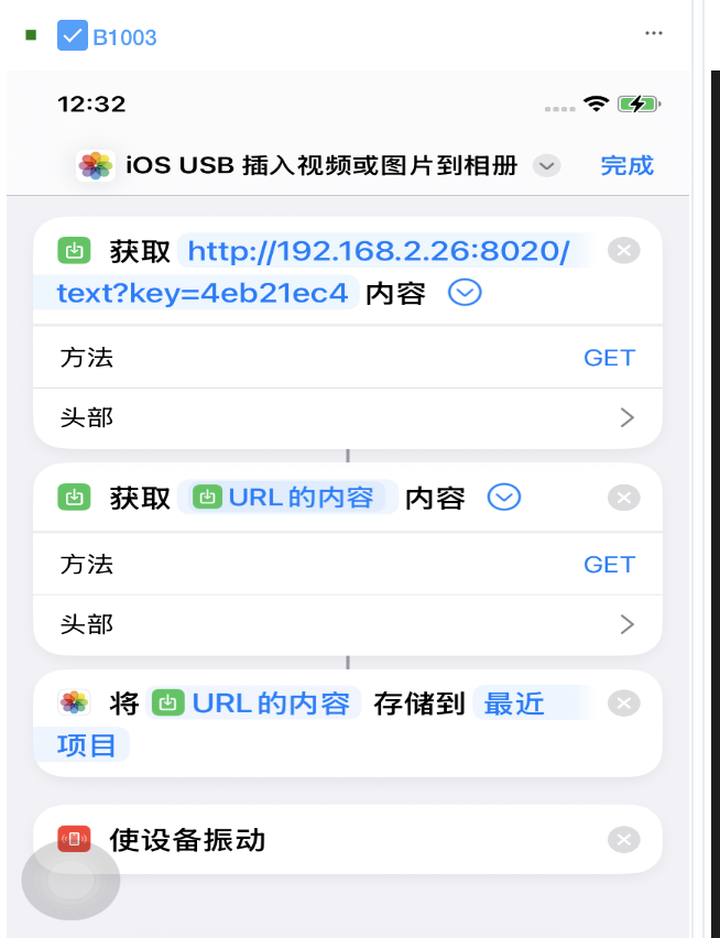 • 在快捷指令app中新建一条指令,名字为iOS USB插入视频或图片到相册,指令内容如下,具体链接参数看文字输入说明
