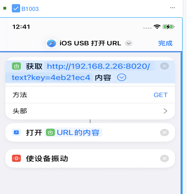 • 在快捷指令app中新建一条指令,名字为iOS USB 打开URL,指令内容如下,具体链接参数看文字输入说明