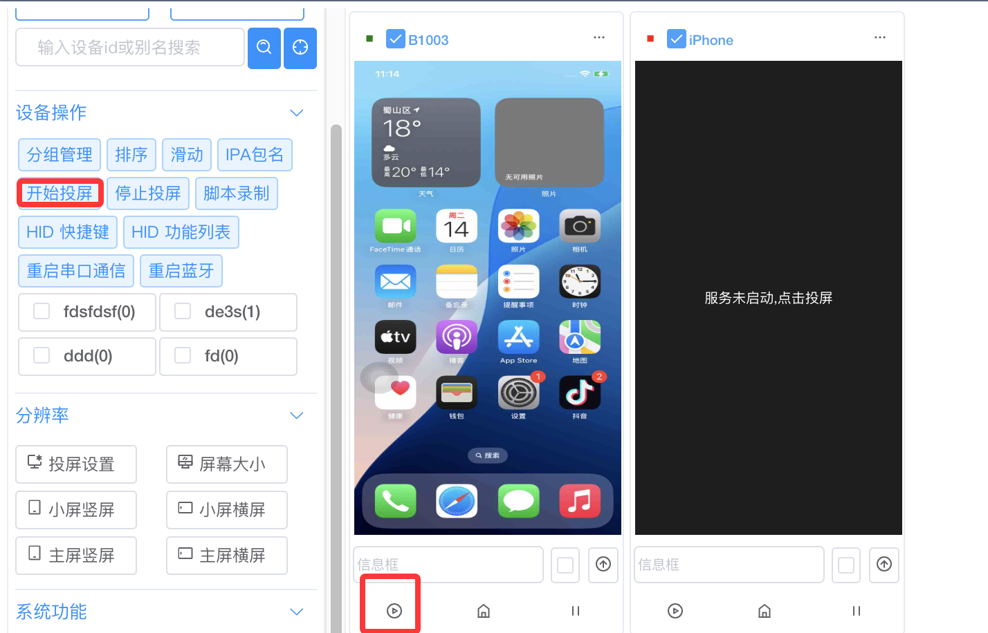 • 在自动化服务能够启动后,并且正确授权了,在投屏界面-左侧工具栏,点击开始投屏按钮,即可看到屏幕的画面