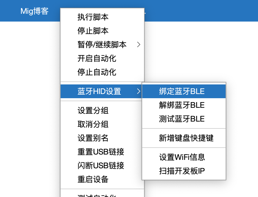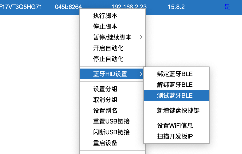 - 选择一个设备,鼠标右键菜单,选择蓝牙HID设置-测试蓝牙BLE