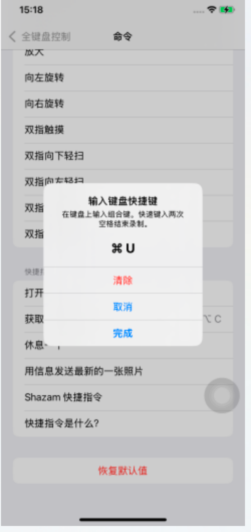 手机设置-辅助功能-键盘与键入-全键盘控制-命令选项,划到最下,找到刚才新建的快捷指令的名称,这里的案例叫获取URL内容,点击一下