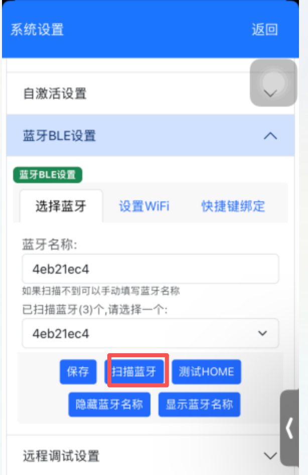 - 如果第一次扫描不到,就暂停,再次扫描。完成后选择一个蓝牙,点击保存按钮,在点击测试HOME按钮,如果返回到桌面代码成功了