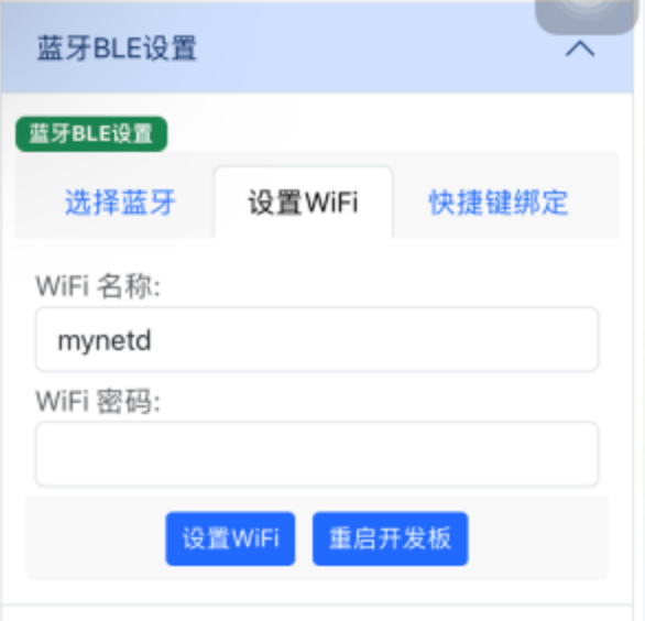 - 进入app的设置,蓝牙BLE设置,设置WIFI选项,填写需要链接的WiFi名称和密码,点击设置WiFi按钮,如果提示成功了,就点下重启开发板