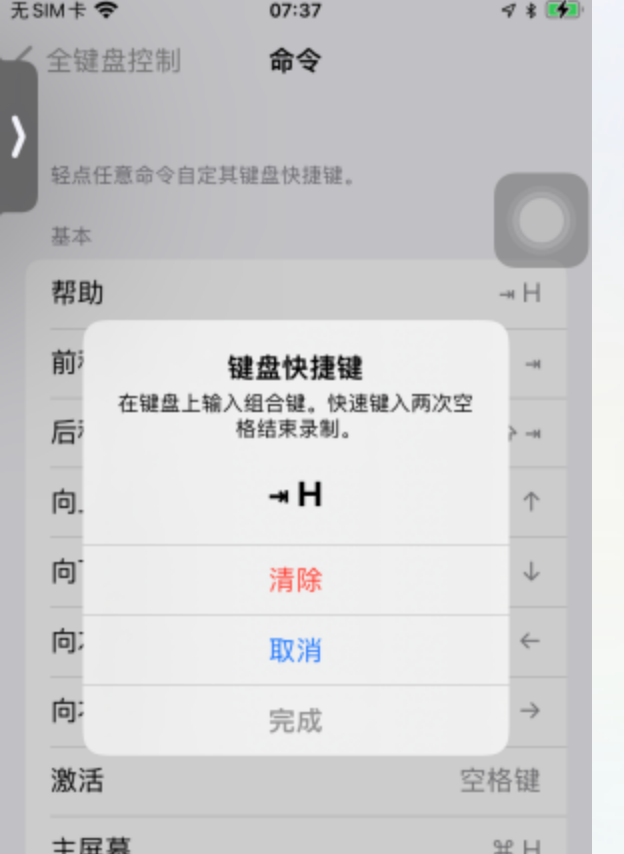 - 先打开手机设置-辅助功能-键盘-全键盘控制-命令选项,点击某个命令,会出现弹窗,要求输入键盘快捷键