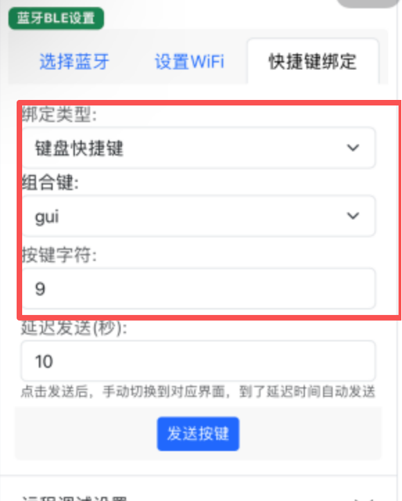 - 双击HOME(没有HOME从底部往上滑切换任务),切换到app设置-蓝牙BLE设置-快捷键绑定界面,选择绑定类型为键盘快捷键,组合键和按键字符自己填写即可,然后点击发送