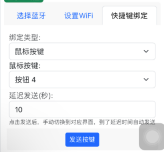 - 双击HOME(没有HOME从底部往上滑切换任务),切换到app设置-蓝牙BLE设置-快捷键绑定界面,选择绑定类型为鼠标按键,再选择鼠标按键值,一般建议从按钮4开始,防止冲突