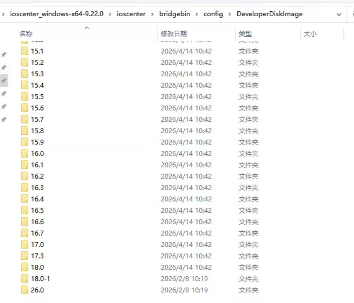 • 将下载的开发者镜像-DeveloperImage12.4-26.x.zip,解压到ioscenter/bridgebin/config/DeveloperDiskImage文件夹内,目录结构内容如下
