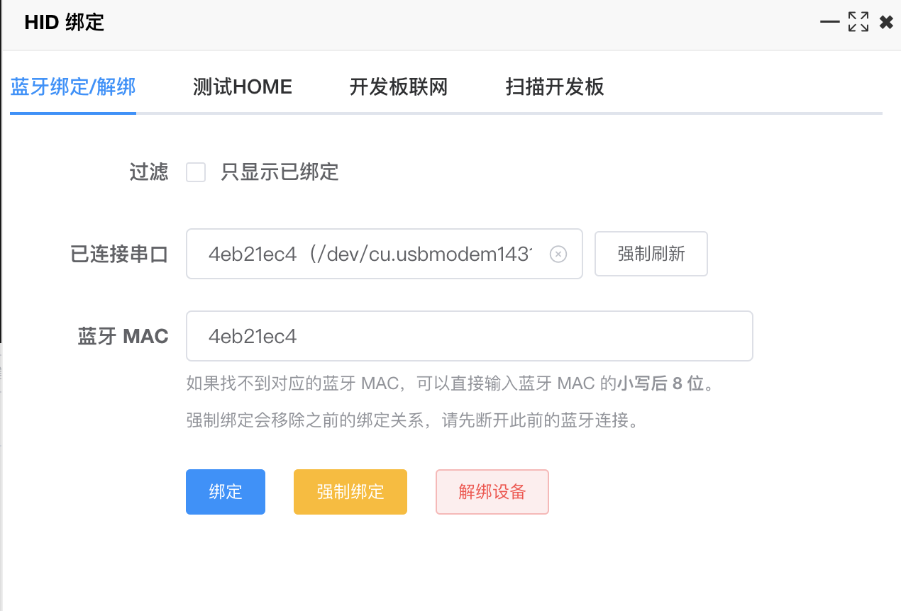 • 在连接设备,小屏幕上鼠标右键菜单-HID功能-HID蓝牙绑定/解绑