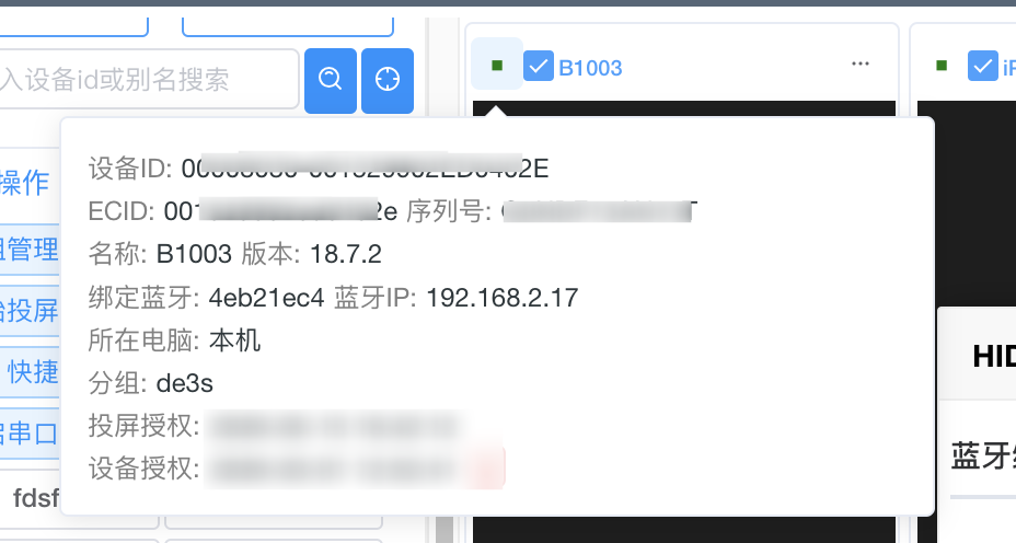 • 链接到手机后,在中控-授权中心,点击批量授权,左侧是设备ID,右侧是购买的卡号