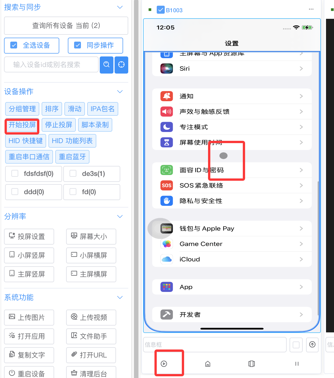 • 在自动化服务能够启动后,并且正确授权了,在投屏界面-左侧工具栏,点击开始投屏按钮,即可看到屏幕的画面