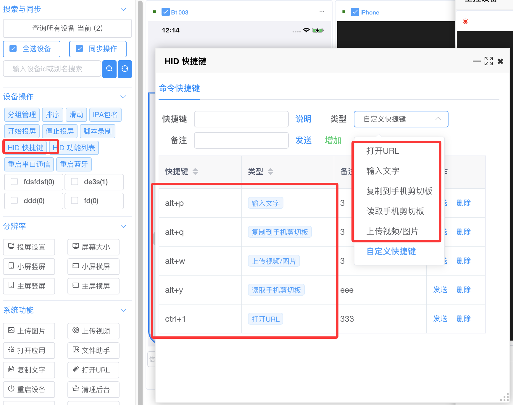• 投屏界面,左侧工具栏-HID 快捷键功能