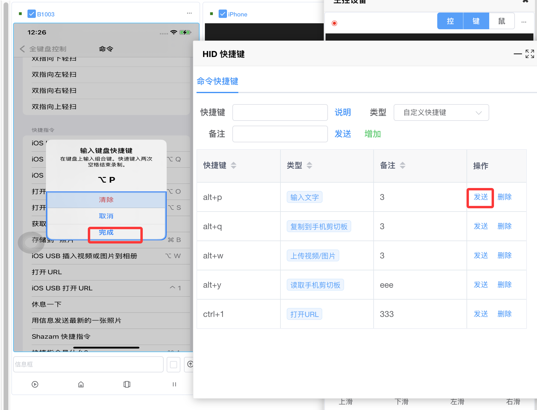 • 点击这个一条指令,会提示需要设置快捷键,在投屏的 HID 快捷键中点击 输入文字快捷键对应的发送,看到手机上变化后,点击手上面的完成按钮