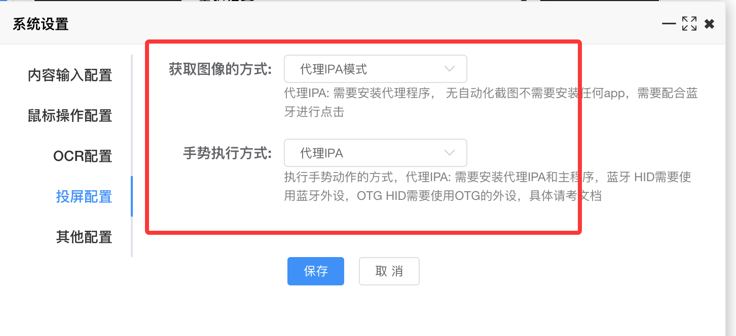 • 请在投屏界面-系统设置-投屏配置,都改成代理IPA方式