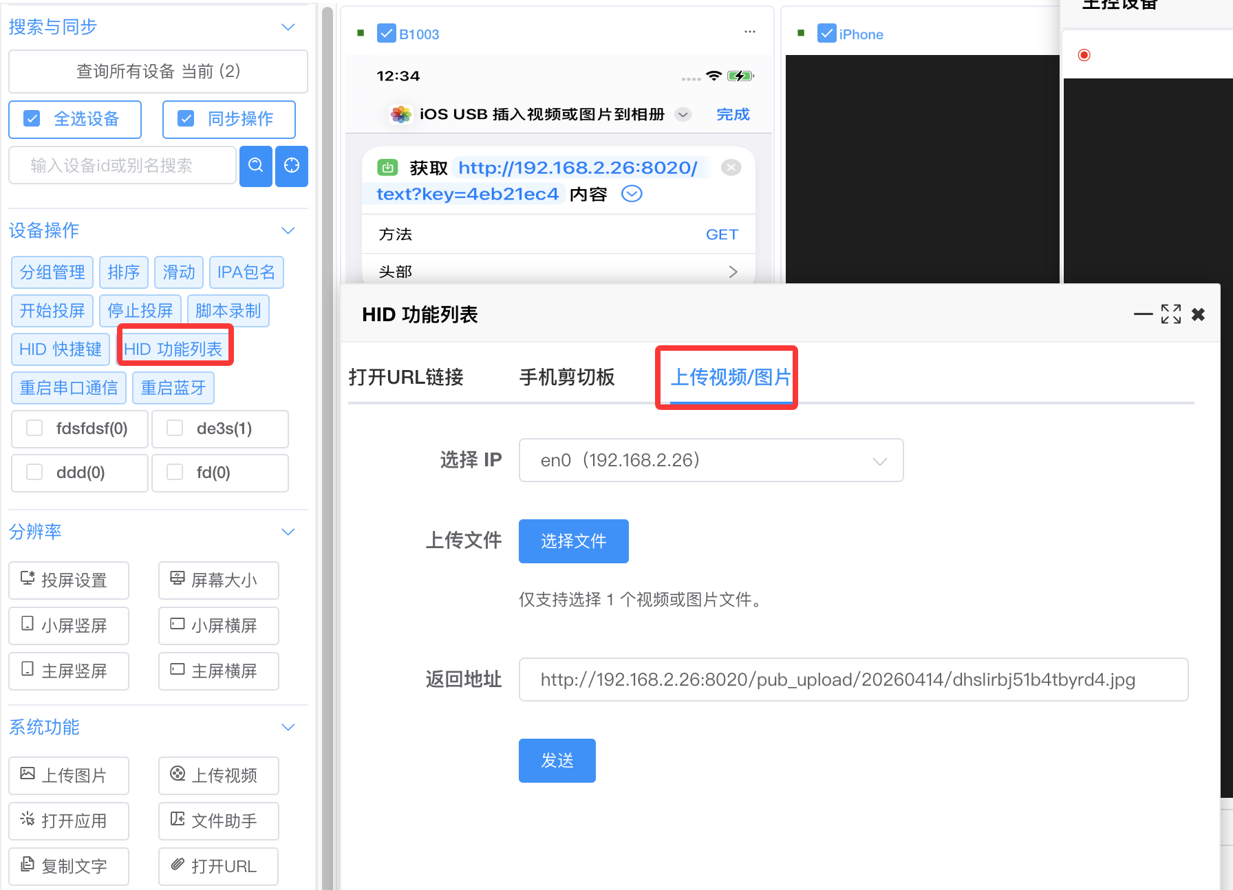 • 工具栏-HID功能列表,或者小屏幕上 鼠标右键-HID功能列表,进入上传视频/图片选项