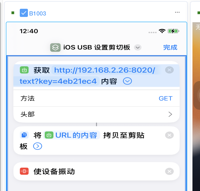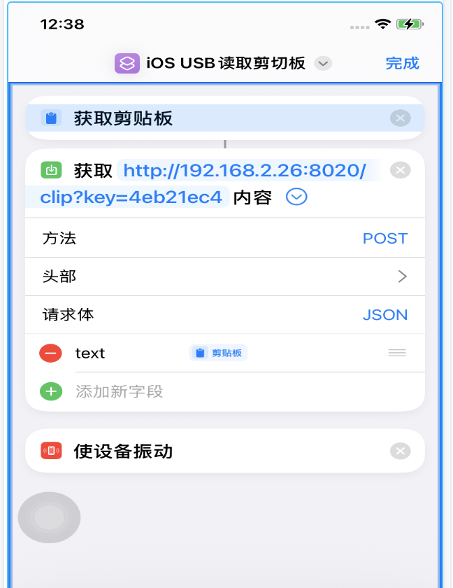 • 在快捷指令app中新建一条指令,名字为iOS USB读取剪贴板,指令内容如下,具体链接参数看文字输入说明