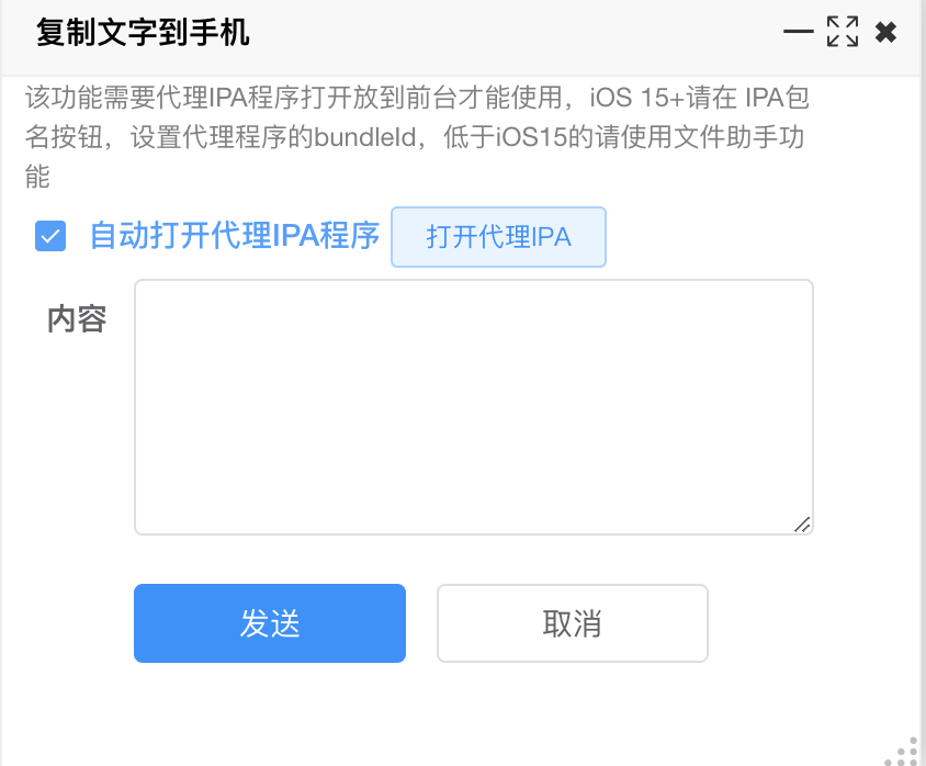 • 高于iOS 15系统,剪切板操作需要将代理IPA至于前台,请点击打开IPA按钮,然后在发送文字