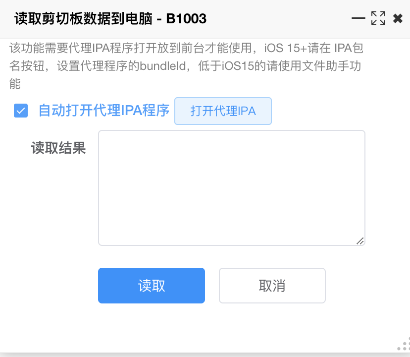 • 高于iOS 15系统,剪切板操作需要将代理IPA至于前台,请点击打开IPA按钮,然后在进行读取