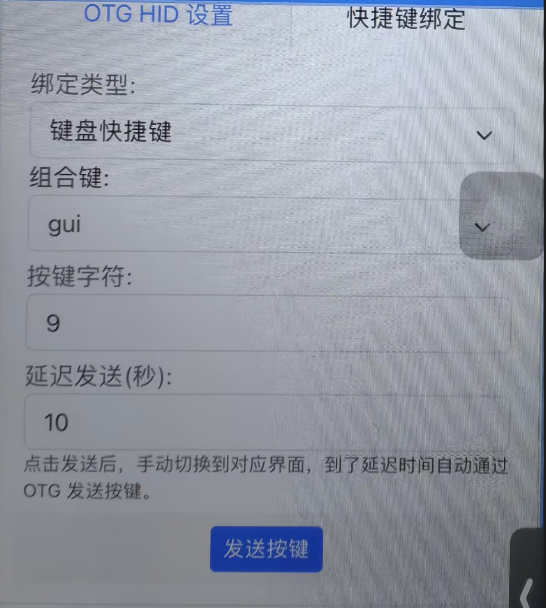 • 双击HOME(没有HOME从底部往上滑切换任务),切换到app设置-OTG HID设置选项-快捷键绑定界面,选择绑定类型为键盘快捷键,组合键和按键字符自己填写即可,然后点击发送