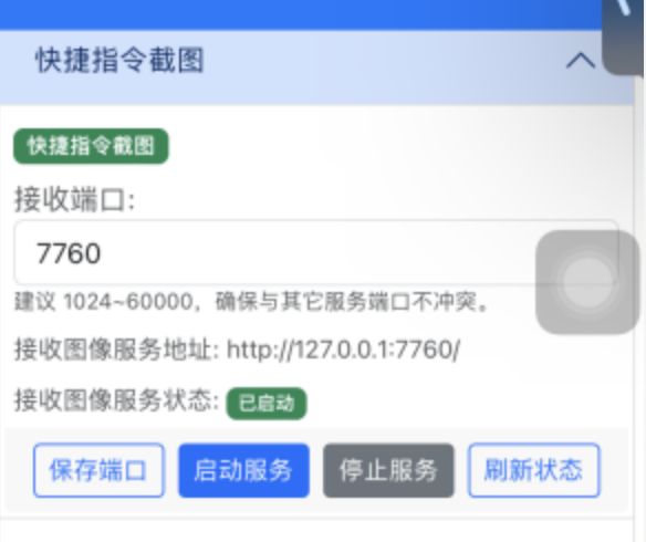 • 进入App设置-快捷指令截图选项,默认端口为7760,启动服务,也可通过代码启动服务