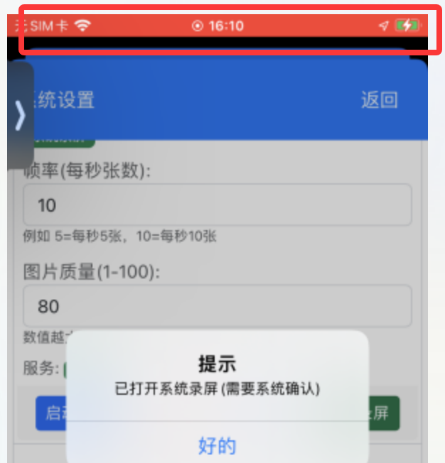 • 进入App设置-系统录屏设置,可以配置截图帧率和图片质量,一般默认就行